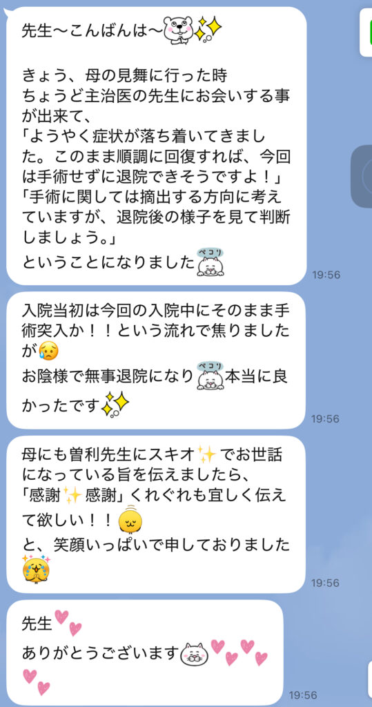 このまま順調に回復すれば、今回は手術せずに退院できそうですよ!」